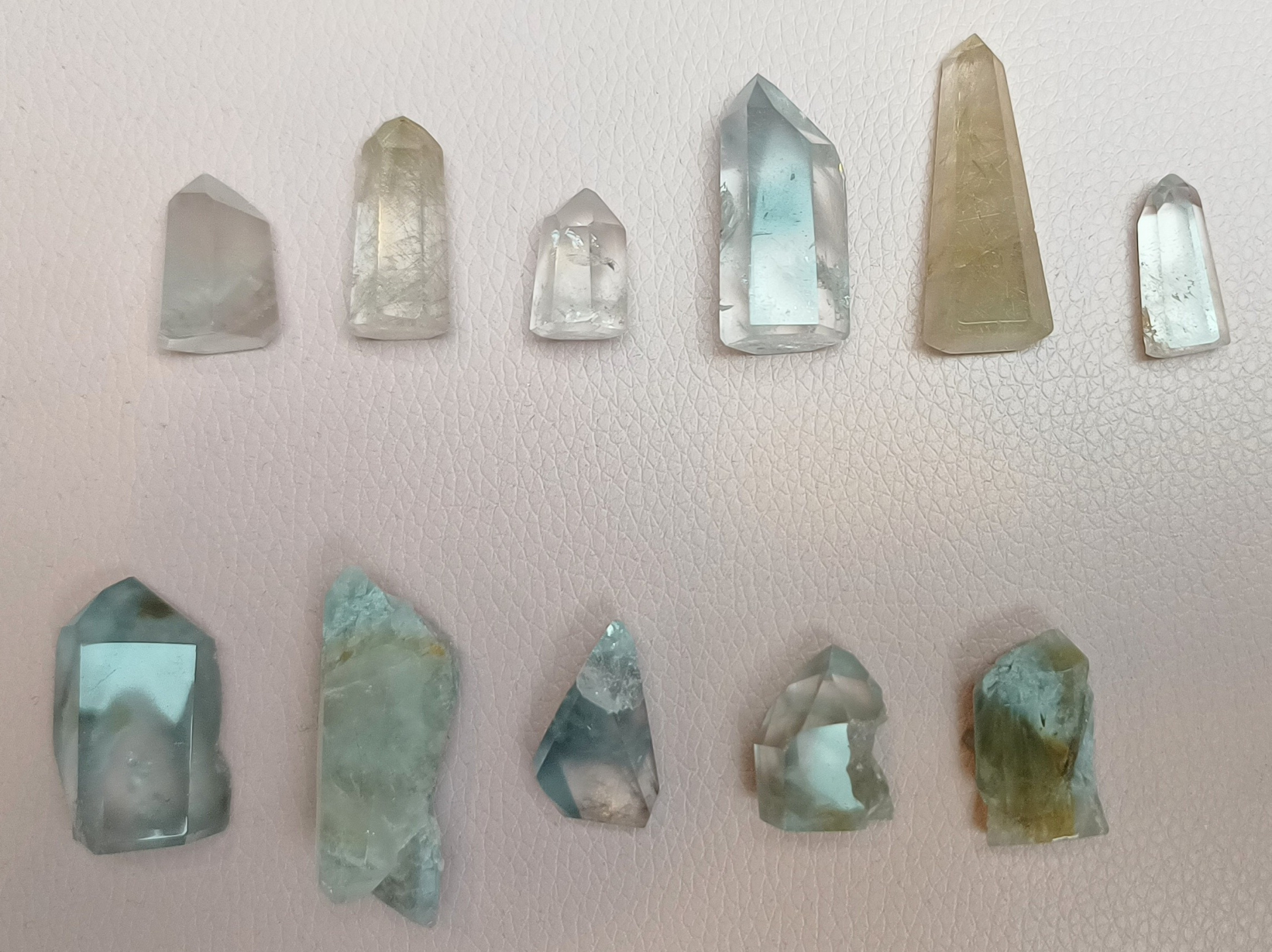 Broušené špice a tvary z křemenu se sagenitem nebo modrým amfibolem